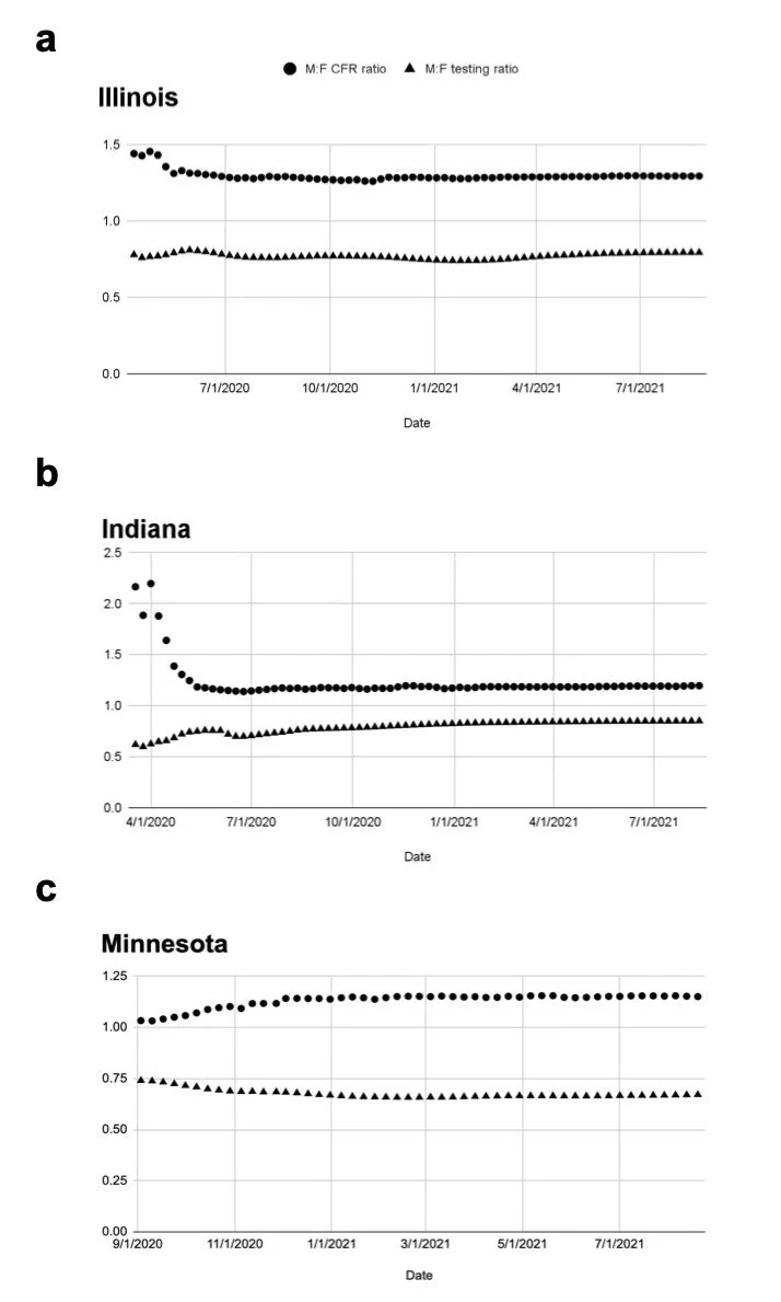In our article, we examined how this potential bias caused by testing rates impacts the COVID-19 CFRs that are observed among women and men. We analyzed sex-disaggregated COVID-19 testing, case, and death data from the three states for which these data are available: Illinois, Indiana, and Minnesota (the Indiana data portal was active at the time of analysis but is no longer active). In all three states, women are tested more often than men. In our paper, we discuss some likely reasons why this is the case, including frequent testing among healthcare workers (who are disproportionately women) and pregnant people, and generally higher health care seeking behaviors among women -- all of these make it likely that more cases, especially mild and asymptomatic cases, will be detected in women than in men. That is, men are more like scenario 1 above, and women are more like scenario 2.
